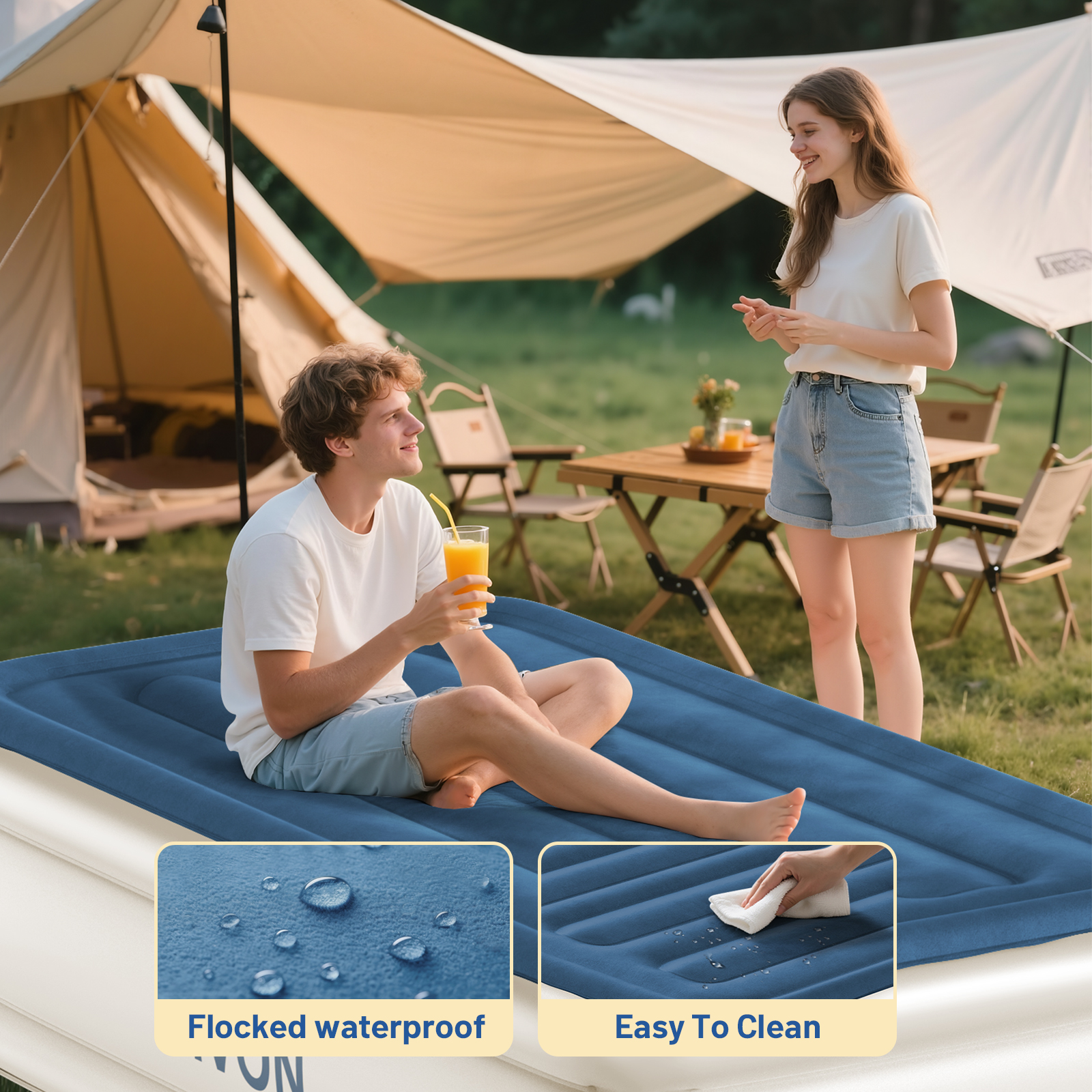 Enhanced Comfort and Elegance: Featuring an elegant wave pattern and soft suede topper, the air mattress provides superior comfort with waterproof features.The indented sides of our inflatable mattress hold fitted sheets perfectly in place, ensuring a smooth and uninterrupted sleep