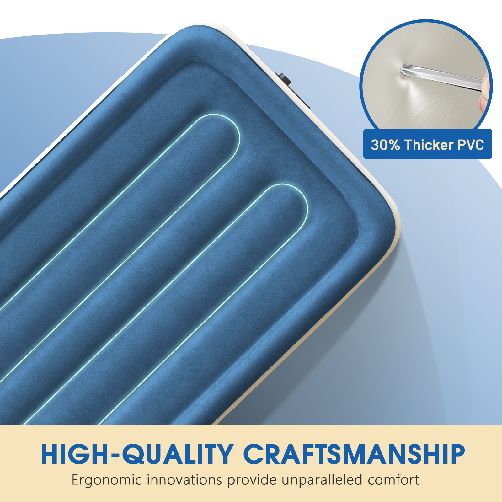 - Elevated Material Craftsmanship - With 30% thickened PVC upgrade, this inflatable mattress offers better toughness and long-term wear resistance.