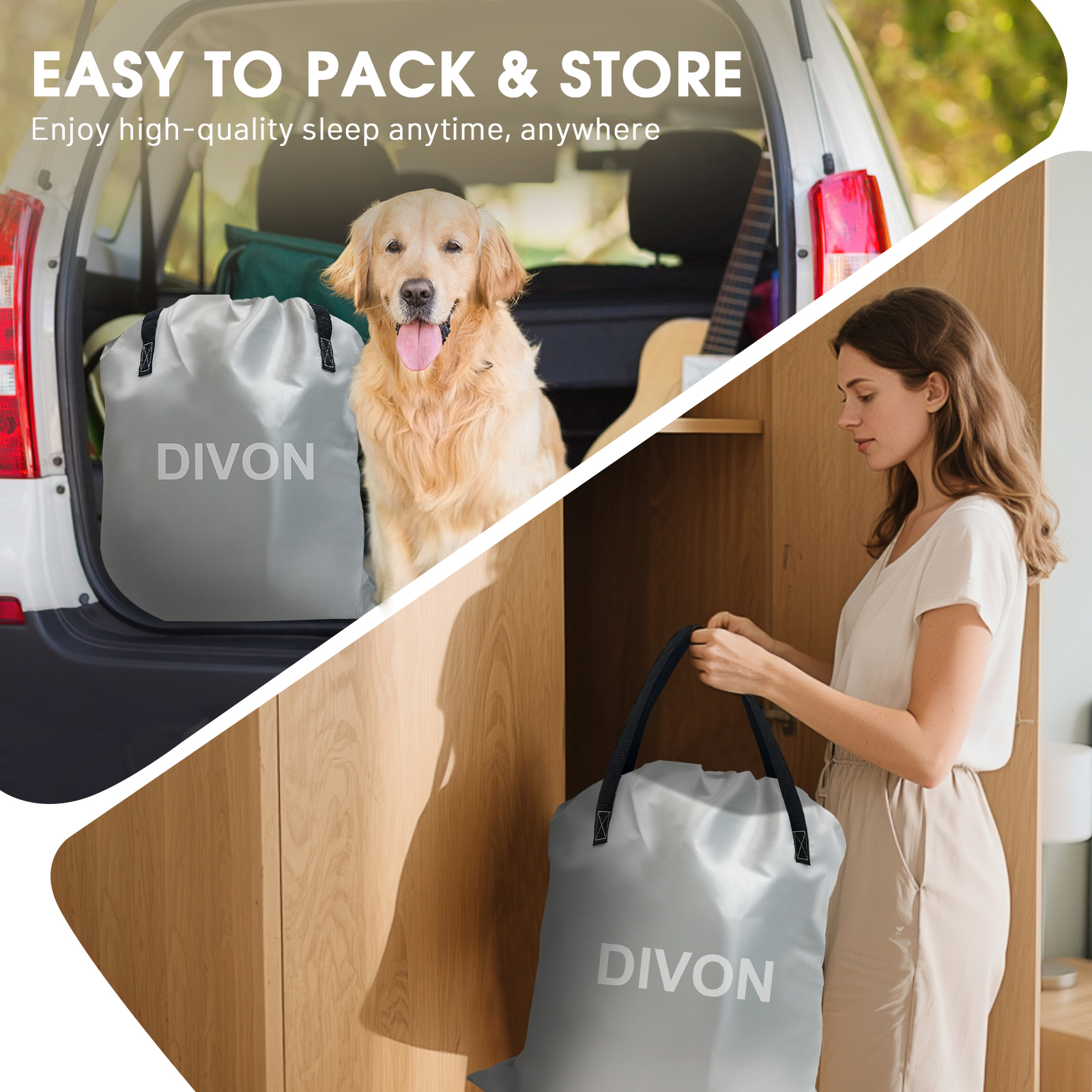 【3-Min Bed-to-Bag】 120V pump (2-min setup) + 13lbs ultra-light. Carry bag stores flat in closets/RVs/cars.