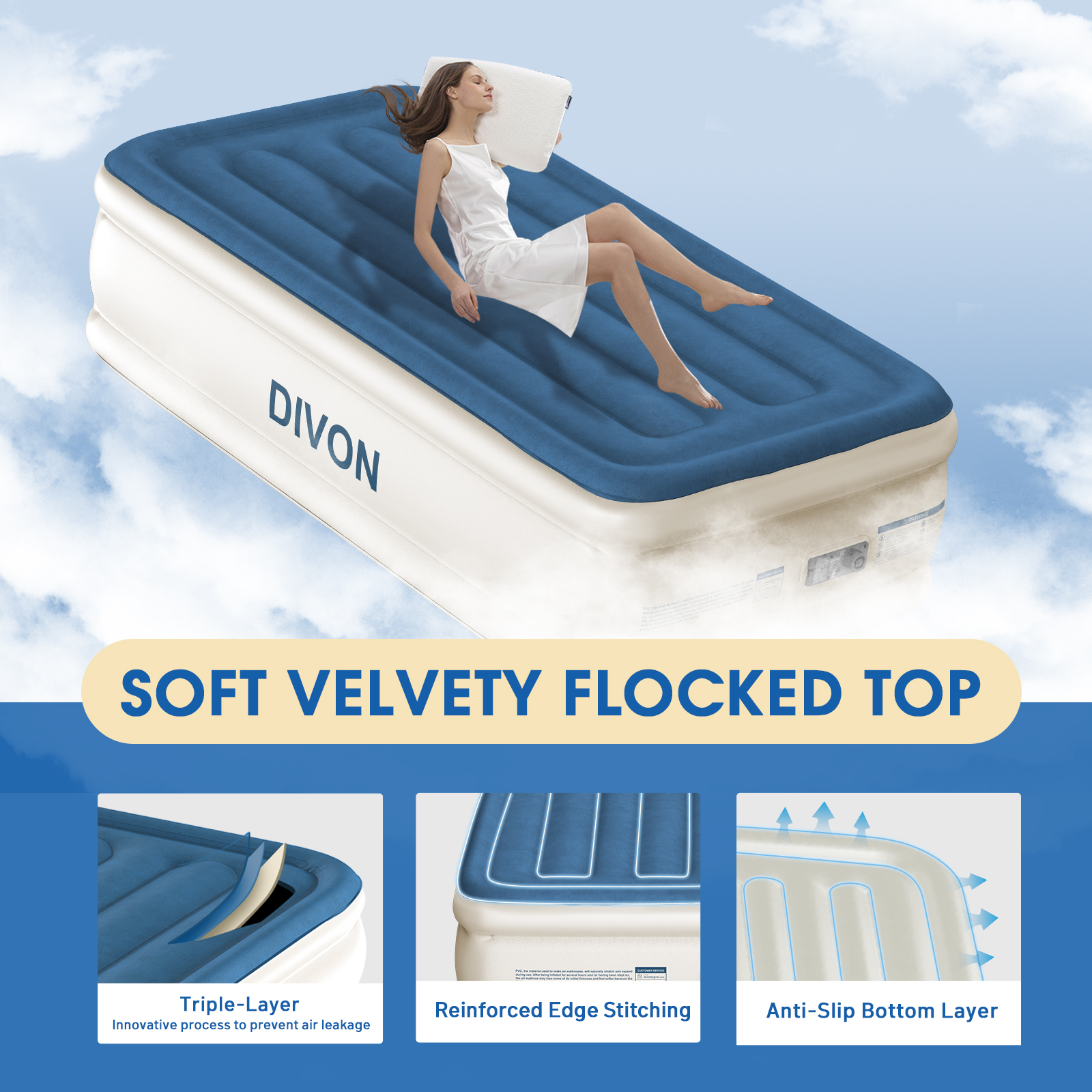 - Luxury Flocked Surface - Covered with a premium flocked surface for plush and luxurious comfort, DIVON queen air mattress is soft to touch and gentle on skin.