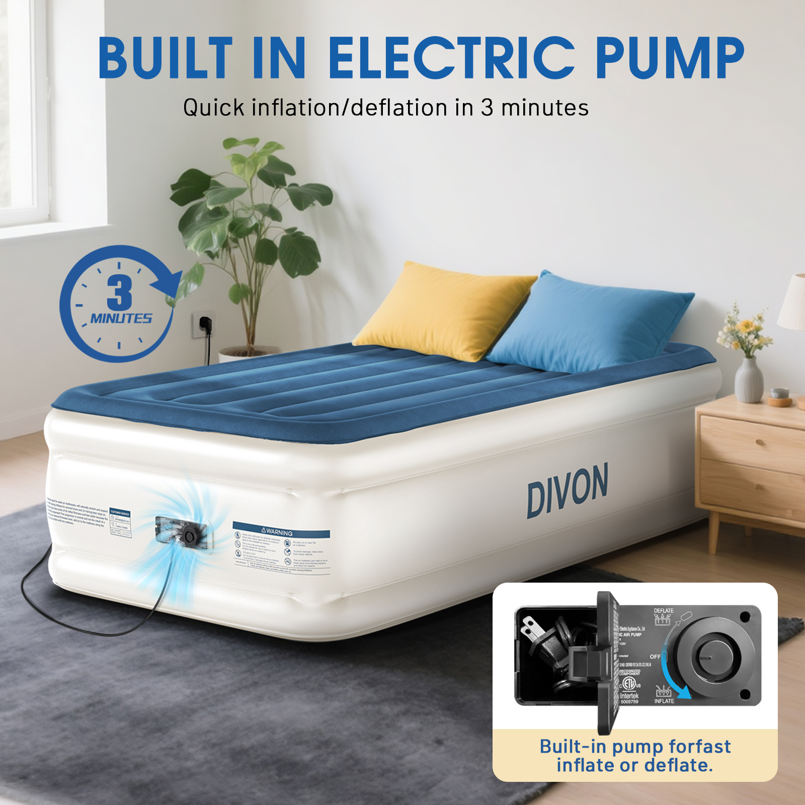 DIVON Air Mattress with Built in Pump,Blow Up Mattress with Wave Pattern,Inflatable Mattress in 2 Mins,Single Twin Size Air Mattress for Camping,Floor&Travel,Portable Air Bed for Adults