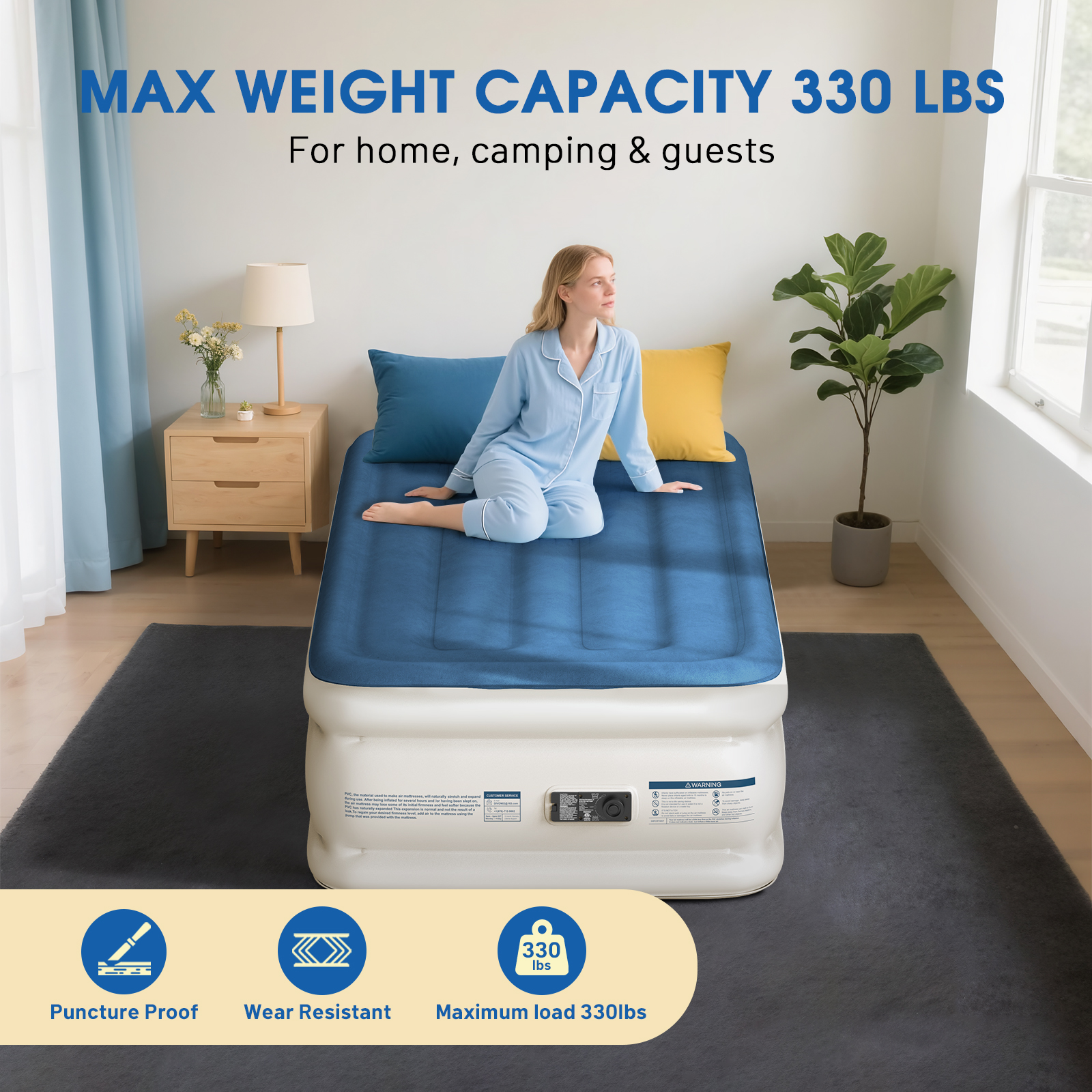 Premium Durability and Stability:Made with industrial-grade, slip-resistant materials, this air mattress offers enhanced stability. Its 30% thicker PVC construction prevents overnight deflation, ensuring you sleep soundly with firm support
