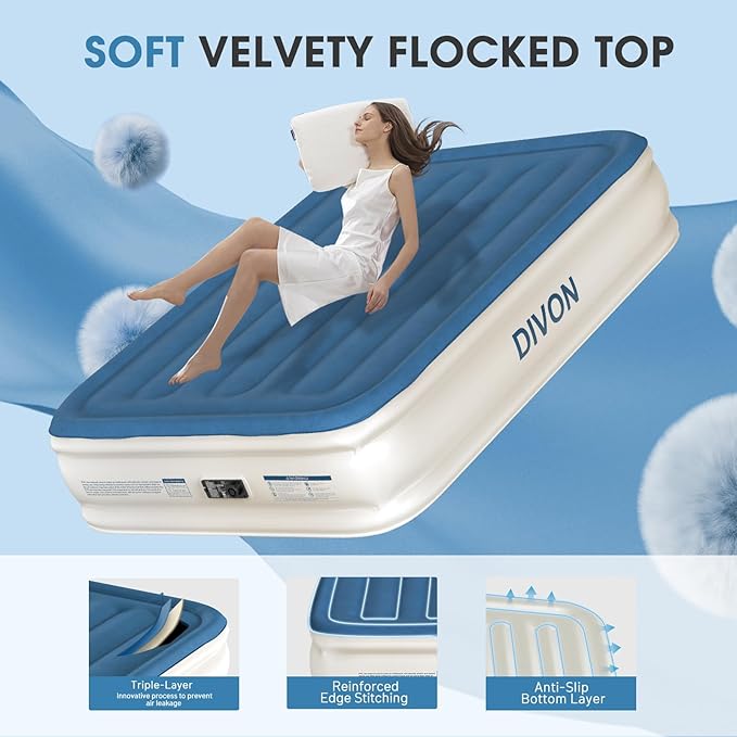 - Luxury Flocked Surface - Covered with a premium flocked surface for plush and luxurious comfort, DIVON queen air mattress is soft to touch and gentle on skin.